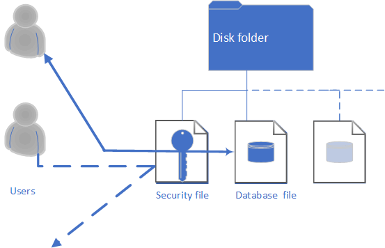 The simplest possible arrangement is to have one security file and one database file held in a disk folder, typically shared to network users. The diagram shows two users: the upper one able to read and write data to the database, the lower one denied all access to the database.