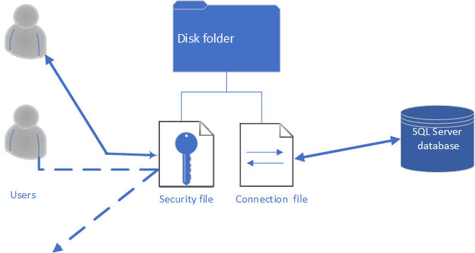 The simplest possible SQL Server arrangement is an extension of the one shown for an Microsoft Access database. There is still a security file, but there is now a connection file in place of the database file, and there is a server to hold the SQL Server database.